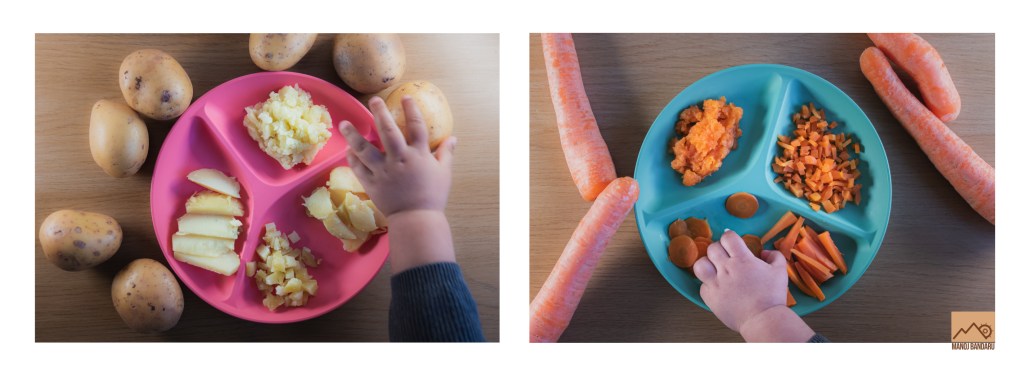 Steam cook the vegetables or fruits until they become soft and mash it into semi liquid ( in smooth) consistency at the very beginning, say at 6th month; later when he/she mastered eating semi liquid consistency then continue giving mashed food with solid consistency as in the image above. As they need only a few spoons of food in the beginning, you can always store the excess food in the fridge and take out little with a fresh spoon every time, it will be fresh for two days. Make sure to store it in a separate rack preferably in the coolest place in the fridge. Now that your little one tried all the veggies and fruits and you are aware of his/her allergies, you can be a little creative or feel like a master chef mixing and exploring different combinations of mashed foods. After that (at around 8th, 9th months) try and give steamed veggies that are grated or chopped into very small bites (your little one will enjoy it as he/she will be getting teeth at that time). Steam cook them in a way that it holds the texture but will melt in their mouth :). Display of many food varieties at a time on their plates can be a bit overwhelming and they end up playing with it instead of eating. So begin with one variety and later on you can add two (one after another works better).